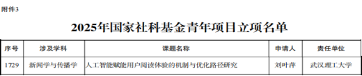 近日,教育部社会科学司、全国哲学社会科学工作办公室先后发布了《2025年度教育部人文社会科学研究规划基金、青年基金、自筹经费项目评审结果的公示》《关于2025年国家社会科学基金项目立项名单的公示》。我院刘叶萍老师申报获得2025年国家社科基金青年项目立项,卜清平特岗教授申报获得2025年国家社会科学基金后期资助项目立项,周群英副教授、阎维博老师申报获得2025年度教育部人文社会科学研究规划基金、青年基金项目立项,具体名单如下: