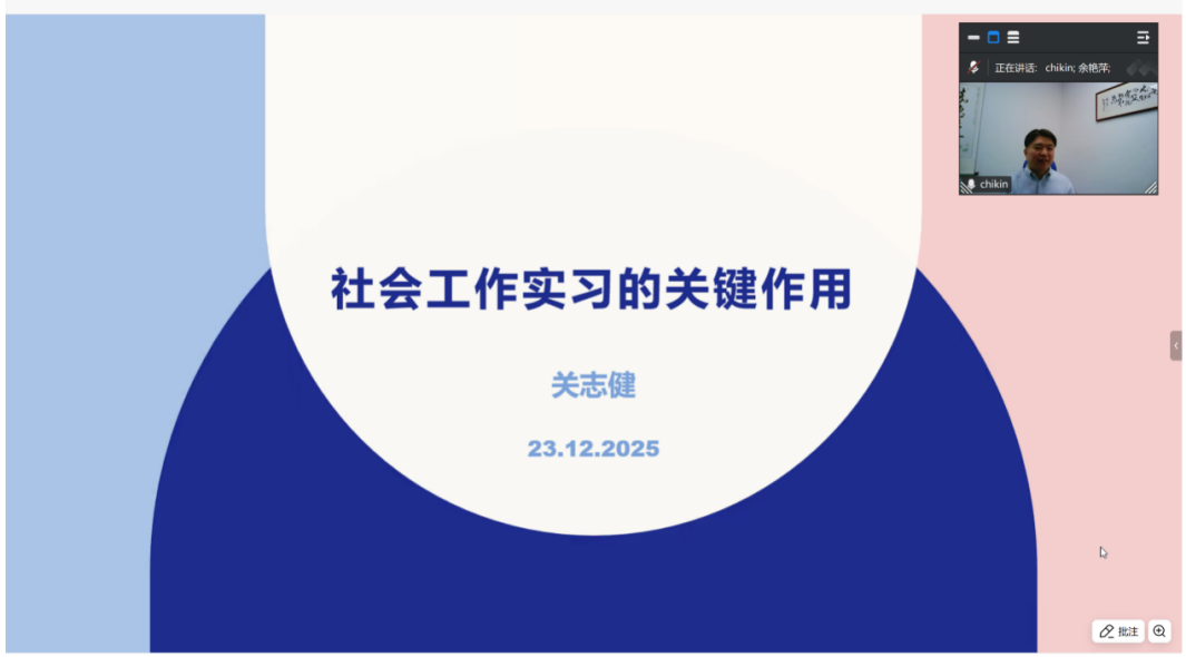 12月23日上午,学院邀请香港城市大学社会及行为科学系关志健副教授开展题为“社会工作实习的关键作用”的专题分享。本次讲座由社会学系主任余艳萍副教授主持,刘卫华副教授以及社会工作专业本科生和研究生共同参与了此次研讨。
