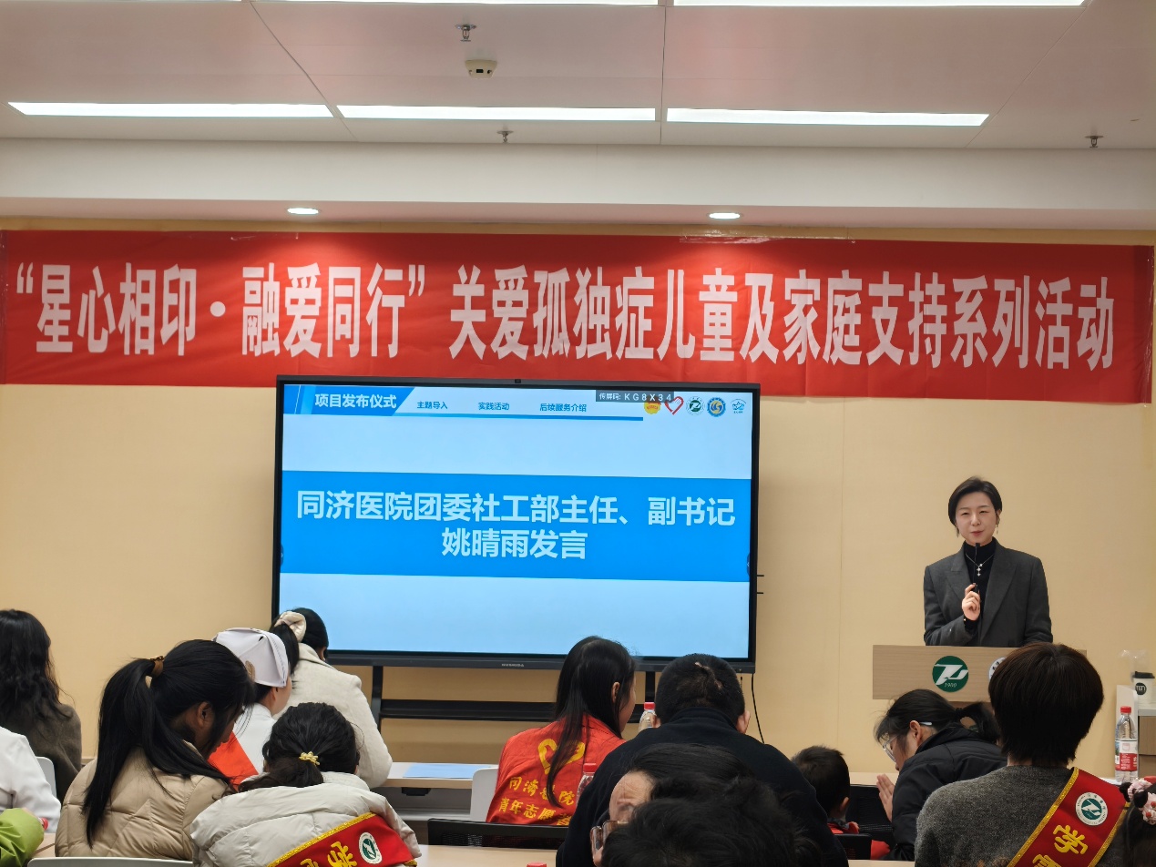 在项目启动仪式上,同济医院与服务队联合发布“星心相印”融合支持系列服务,并公布涵盖亲子手工、社交游戏、家长沙龙等活动安排。同济医院团委副书记、社工部主任姚晴雨首先致辞,她表示同济医院儿童保健科将持续为项目提供专业医疗支撑,为参与的孤独症儿童家庭提供科学、可靠的支持,并对与心心语志愿服务队的合作表达出强烈的信心和支持。