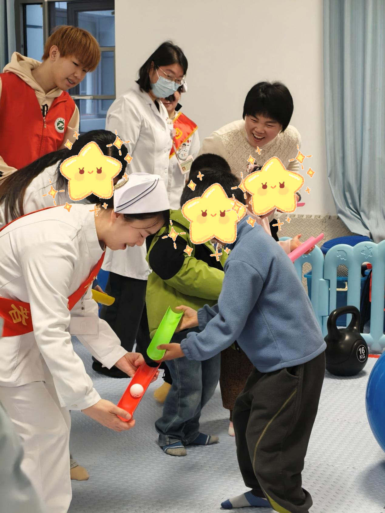在游戏组中,志愿者与星宝们合作完成多种互动游戏。在游戏过程中,部分星宝不再是紧紧依偎在家长身边,而是主动与其他人员互助合作,志愿者则在细节中给予星宝们不尽的善意与温暖。