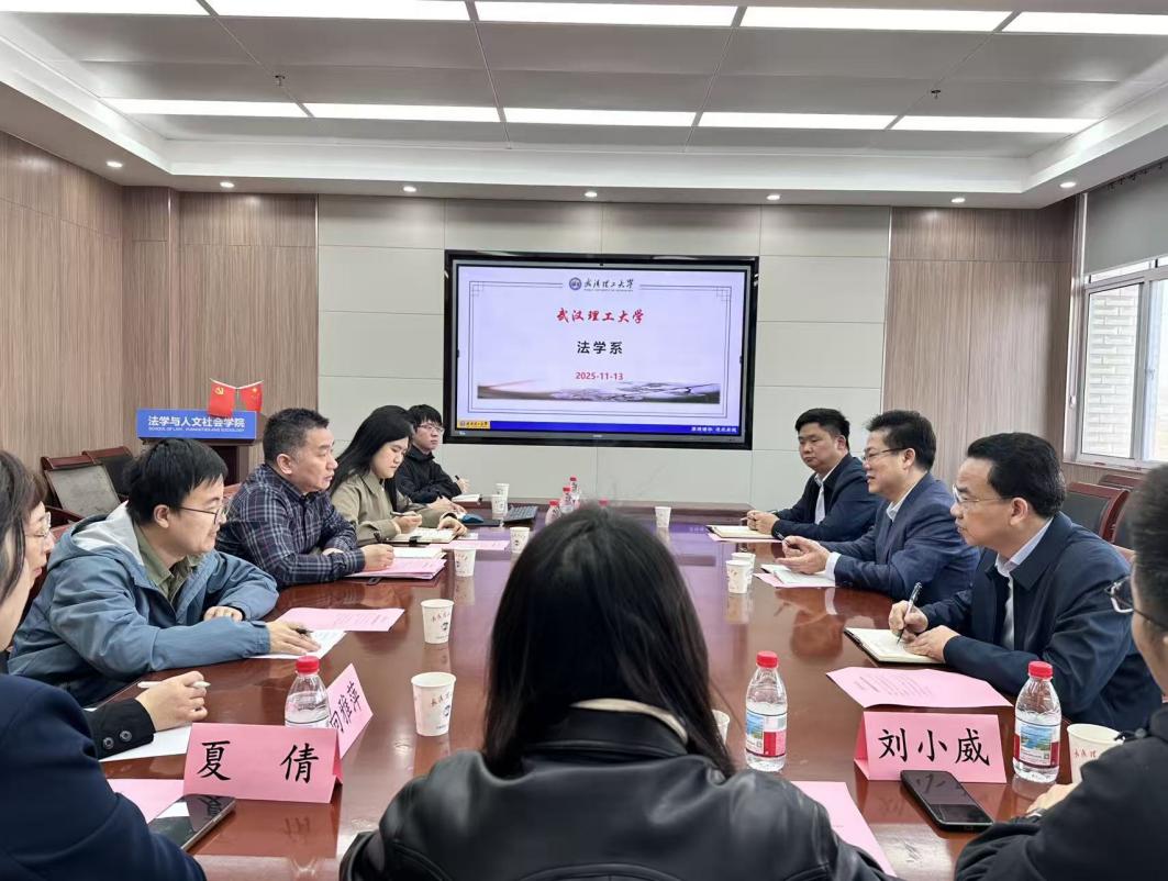 2025年11月14日上午,武汉海事法院党组书记、院长李群星,党组成员、政治部主任许道恒,研究室副主任杨国峰一行到访我院,开展座谈交流。座谈会由学院副院长吴露主持,院长刘介明致欢迎辞。专硕中心主任孟奇勋,法学系副主任夏倩、薛志华以及学院青年教师代表参会。