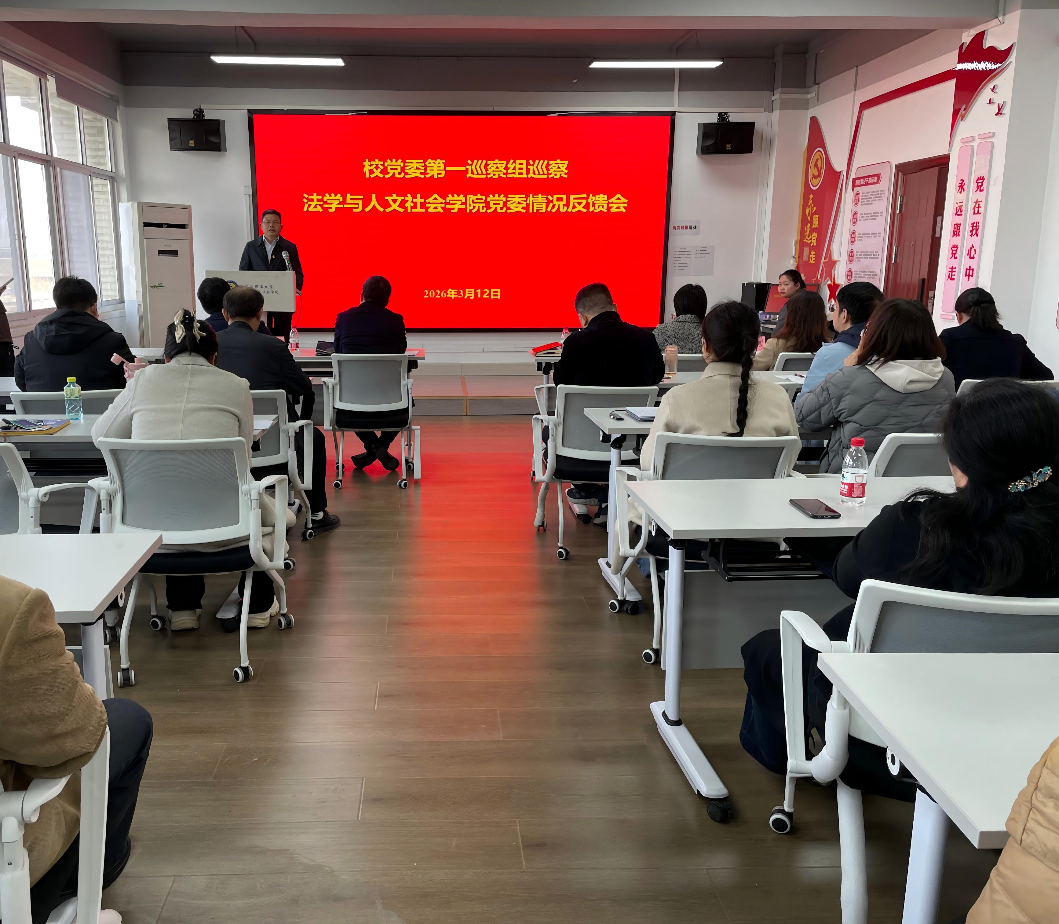 李金发指出,此次巡察是学校党委对法学社会学院党委全面从严治党和改革发展工作的一次把脉会诊和引路导航,是对全体党员干部职工的一次政治体检,学院党委要提高政治站位,切实增强巡察整改政治自觉;突出问题导向,确保巡察反馈意见整改到位;深化整改成果,巩固形成巡察整改长效机制。他强调,要紧密结合当前正在开展的树立和践行正确政绩观学习教育,将“立党为公、为民造福、科学决策、真抓实干”总要求贯彻到巡察整改的全过程各方面,坚持为人民出政绩、以实干出政绩;通过以巡促改、以巡促建、以巡促治,持续营造风清气正、干事创业的良好政治生态和育人环境,以巡察整改实绩实效确保“十五五”开好局、起好步,切实推动学校和学院高质量发展。